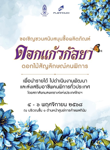 ศูนย์การค้าแพลทินัม ขอเชิญชวนร่วมกันอุดหนุนผลิตภัณฑ์ “ดอกแก้วกัลยา” ดอกไม้พระราชทานสัญลักษณ์คนพิการ