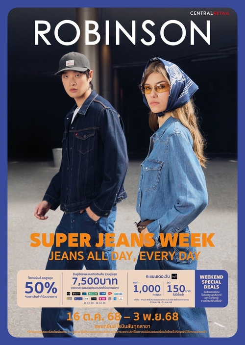 มาร่วมคิกออฟซีซันยีนส์สุดคูลในงานยีนส์ งานใหญ่แห่งปี “ROBINSON SUPER JEANS WEEK 2025” ที่รวมที่สุดของเทรนด์แฟชั่นยีนส์ ดีลสุดคุ้ม และกิจกรรมไว้ครบในงานเดียว! ตั้งแต่วันนี้ – 3 พฤศจิกายน 2568 ณ ลาน CASCATA ชั้น G ศูนย์การค้าฟิวเจอร์พาร์ค รังสิต และที่แผนกยีนส์ ห้างโรบินสันทุกสาขาทั่วประเทศ (ยกเว้นสาขาจังซีลอน) รวมทั้งทุกช่องทางการช้อปปิ้งของห้างฯ ไม่ว่าจะเป็น Robinson Chat & Shop Robinson Personal Shopper on Demand ผู้ช่วยช้อปส่วนตัวที่พร้อมดูแลทุกความต้องการ Central App และเว็บไซต์ www.central.co.th ตลอด 24 ชั่วโมง และอย่าพลาดติดตามสีสันและความเคลื่อนไหวของงานยีนส์ งานใหญ่แห่งปีในแต่ละภูมิภาคได้อย่างต่อเนื่องที่ Facebook Page: Robinson Department Store เพราะ ‘Jeans All Day, Every Day’ ของจริง ต้องที่ห้างโรบินสันเท่านั้น!