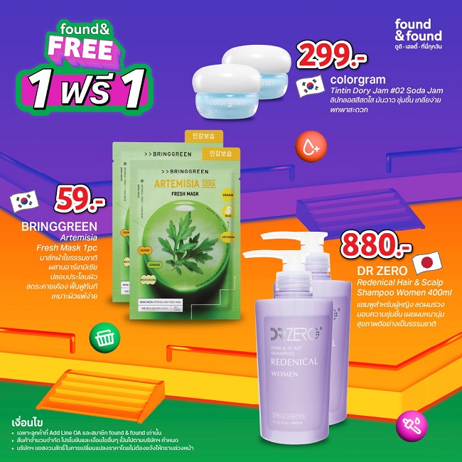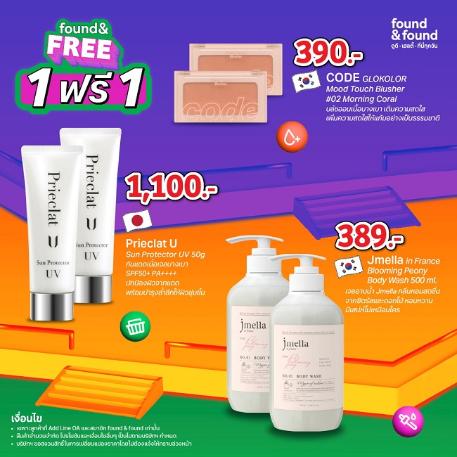 มาพร้อมกับขบวนสินค้าราคาพิเศษ แหล่งรวมไอเทมเด็ดแบรนด์ดังส่งตรงจาก ญี่ปุ่น-เกาหลี JPKR ที่มีมาให้เลือกช้อปส่งท้ายปีก่อนใคร ทั้งสกินแคร์ เมคอัพ มาส์ก ครีมอาบน้ำ ยาสระผม และอื่นๆ อีกมากมายกว่า 1,000 รายการ ใครอยากอัปเดตเทรนด์บิวตี้กับโปรโมชั่นสุดคุ้ม ซื้อ 1 ได้ถึง 2 ชิ้น ก็ไปเลือกช้อปกับบิวตี้ไอเทมยอดฮิตมากมายกันได้แบบจุใจ อาทิ LuLuLun, BRINGGREEN คลีนซิ่งตัวท็อปจาก FIF เจลอาบน้ำ Jmella กันแดดอันดับหนึ่งจากญี่ปุ่น Pricelat U หรือแบรนด์อื่น ๆ อีกมากมาย เตรียมพร้อมช้อปฟินได้แล้วที่ร้าน found & found ทุกสาขา (ยกเว้นโซน found & found ใน Mitsukoshi และ Foodland) ตั้งแต่วันที่ 1-30 พฤศจิกายน 2568 เท่านั้น! ช้อปนี้มีแต่คุ้มรีบพุ่งตัวไปด่วน