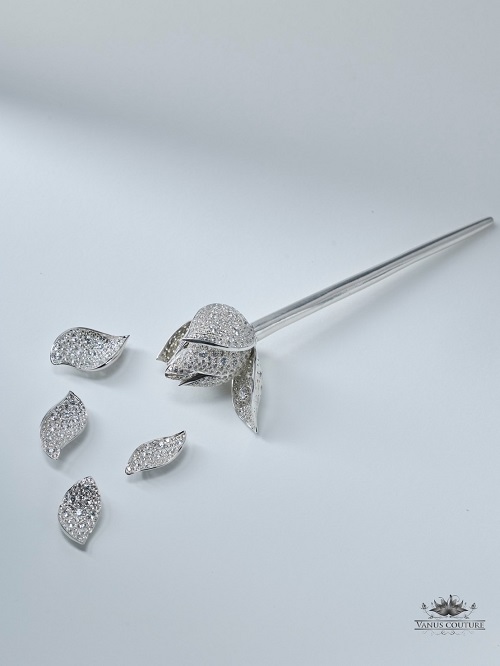 1. เครื่องประดับเรือนผม “กลีบบัว” – กลีบบัวโปร่งบางพริ้วไหว ประดับเพทายขาว เปรียบดั่งบัวลอยน้ำแห่งรักอันบริสุทธิ์