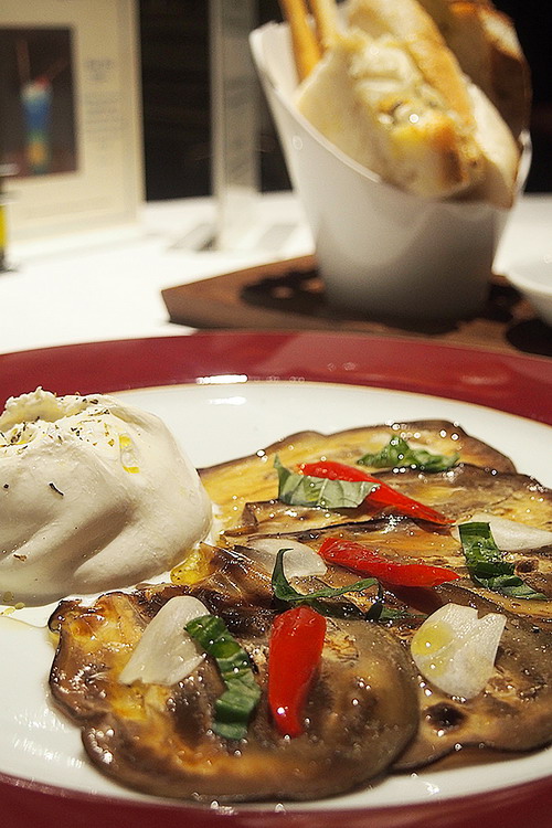 และด้วยคอนเซ็ปของ ‘OpenKitchen’ ที่ตั้งอยู่ตรงกลางร้านฯลูกค้าสามารถมองเห็นทุกขั้นตอนการจัดเตรียมอาหารจานโปรดของท่านได้อย่างใกล้ชิด ประเดิมจากแรกเป็นออเดิร์ฟสวยๆ ตามระเบียบ เมนู Burrata Piccante Sassi –V--ไข่ขาวเนื้อนุ่มทานกับมะเขือเผาที่นำไปอบหอมกรุ่นรสชาติออกเผ็ดนิดๆเพราะโรยด้วยพริกแดงและกระเทียม ทานแค่สองชิ้นกำลังอิ่มพอดี เมนูนี้น่าแชร์กันได้เพื่อไม่ให้อิ่มจนเกินไป